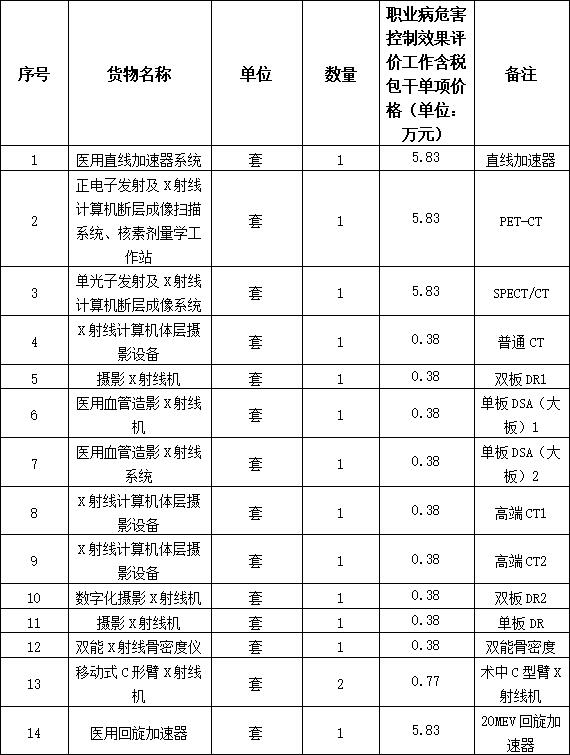 1.1.2服務(wù)內(nèi)容: 綿陽三江醫(yī)院項目(一期)職業(yè)病危害控制效果評價工作全部工作內(nèi)容:進(jìn)行現(xiàn)場驗收檢測并編制職業(yè)病危害放射防護(hù)控制效果評價工作報告書,協(xié)調(diào)市衛(wèi)健部門召開職業(yè)病危害控制效果評價工作報告專家審核會議,通過專家評審,并最終取得批復(fù)。具體設(shè)備如下: