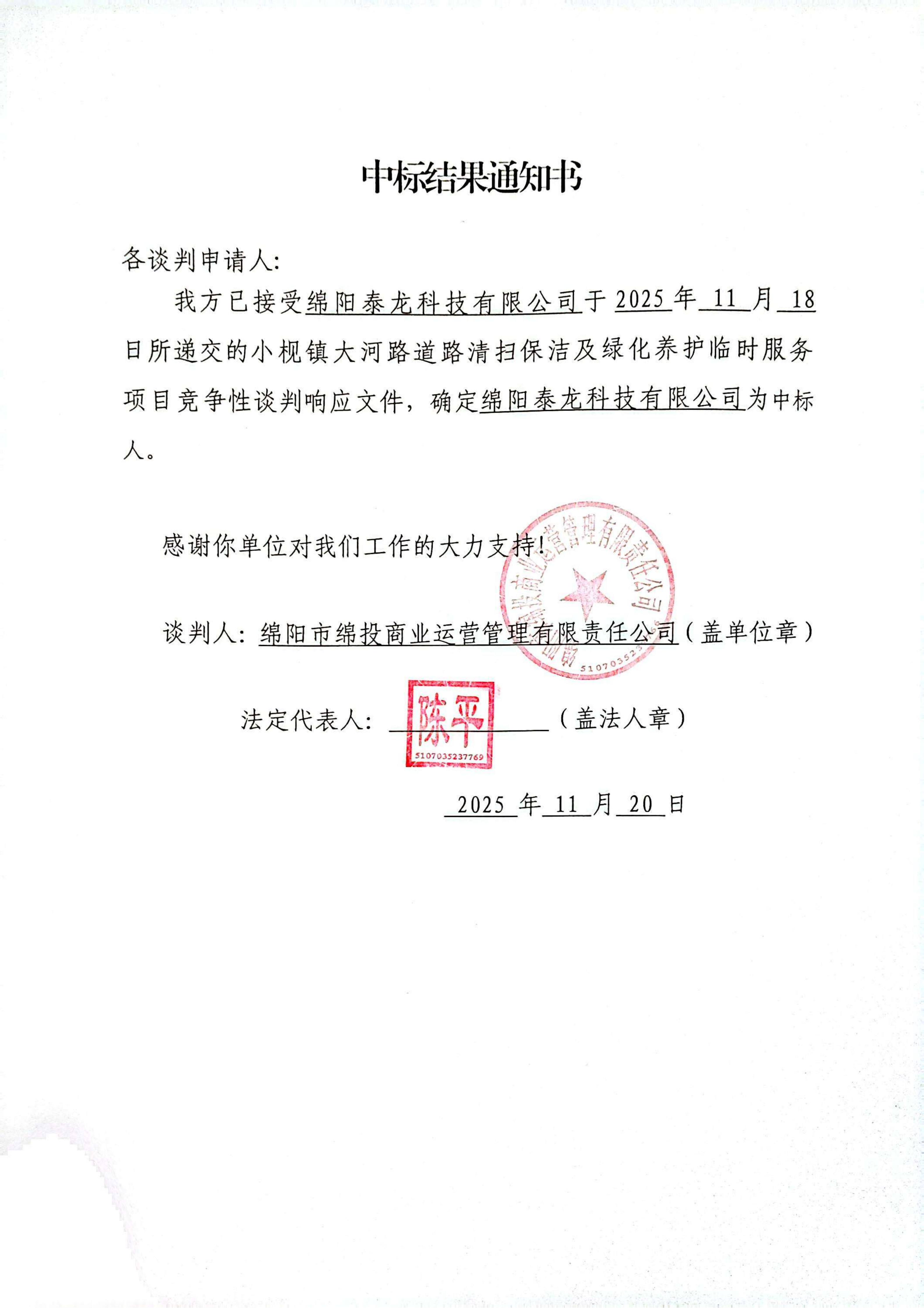 我方已接受綿陽泰龍科技有限公司于2025年 11 月 18 日所遞交的小枧鎮(zhèn)大河路道路清掃保潔及綠化養(yǎng)護臨時服務(wù)項目競爭性談判響應(yīng)文件,確定綿陽泰龍科技有限公司為中標(biāo)人。