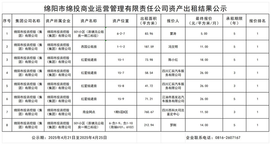 綿陽市綿投商業(yè)運(yùn)營管理有限責(zé)任公司資產(chǎn)出租結(jié)果公示