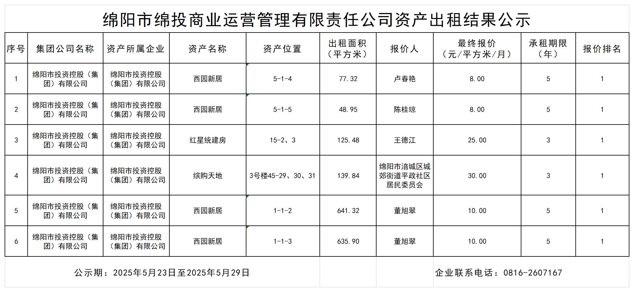 綿陽市綿投商業(yè)運營管理有限責(zé)任公司資產(chǎn)出租結(jié)果公示