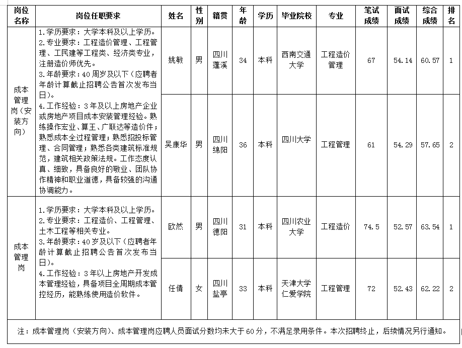 【公開招聘】綿陽市綿投置地有限公司 關(guān)于成本管理崗(安裝方向)等崗位測試成績的公示