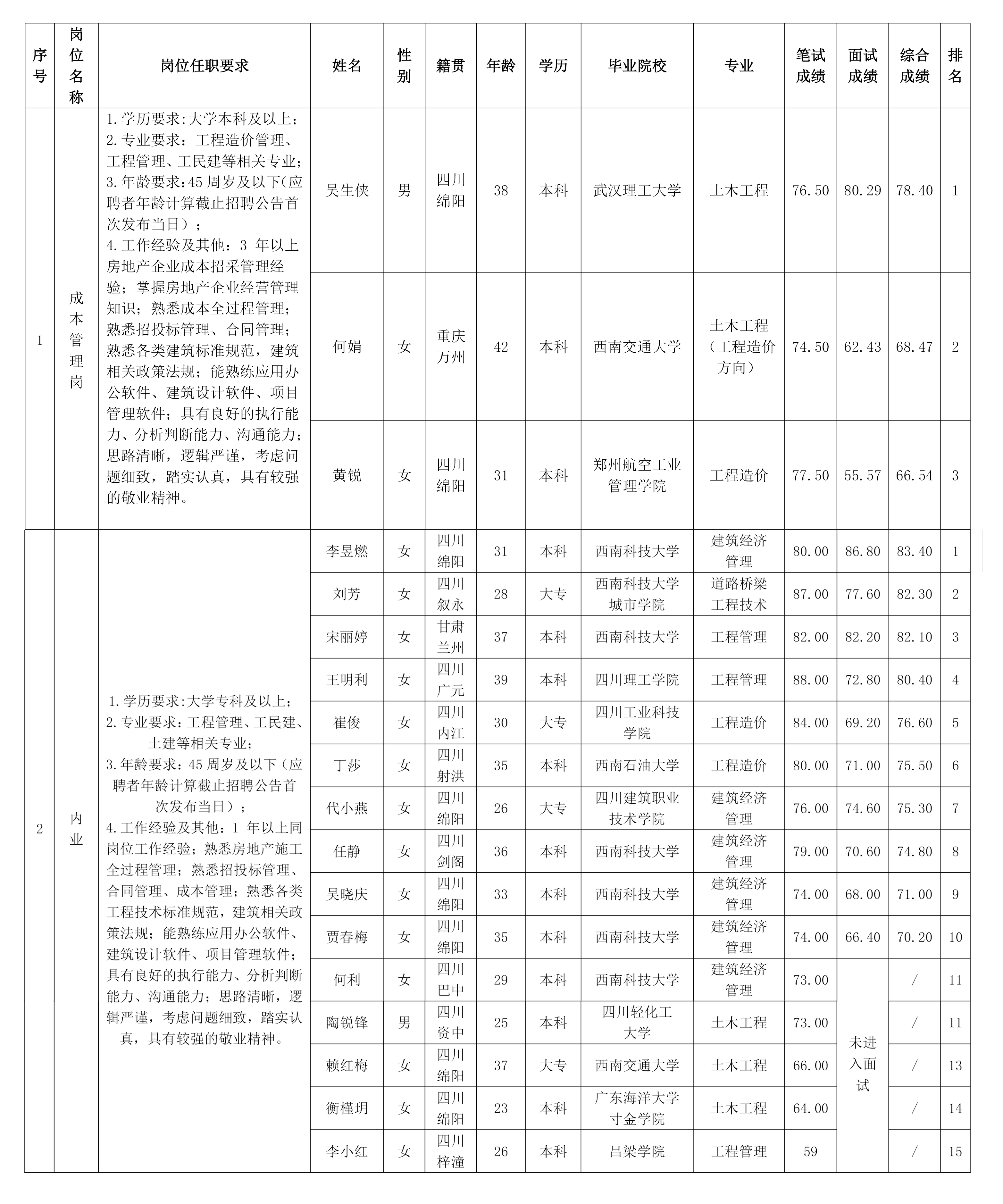 根據(jù)綿陽(yáng)市綿投置地有限公司發(fā)布的招聘公告及招聘相關(guān)規(guī)定,經(jīng)筆試、面試等程序,現(xiàn)將筆試、面試成績(jī)予以公示。