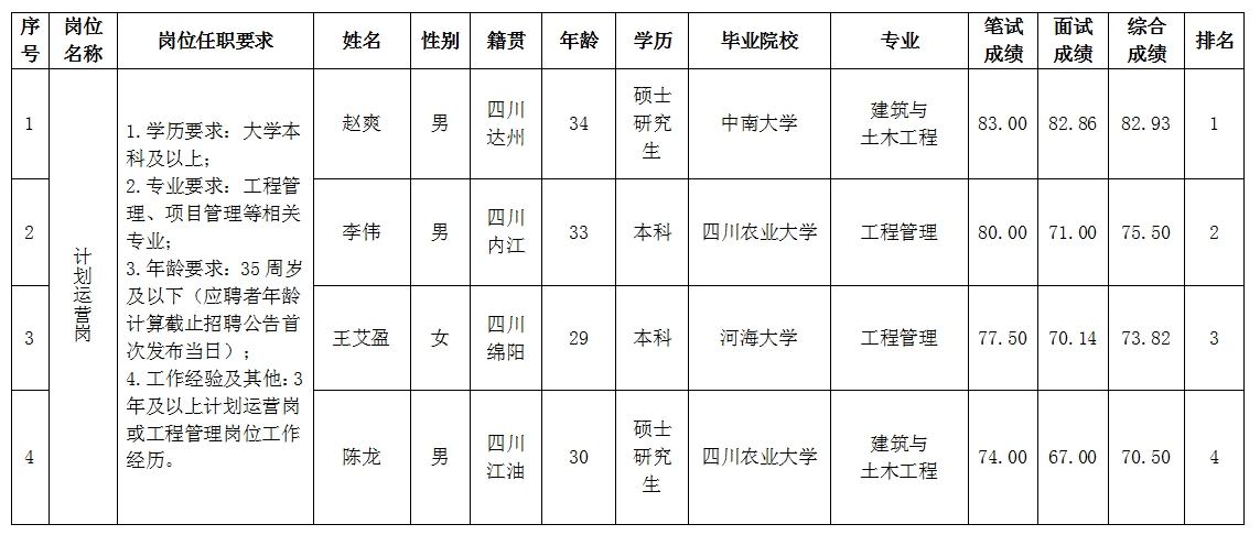 根據(jù)綿陽市綿投置地有限公司發(fā)布的招聘公告及招聘相關(guān)規(guī)定,經(jīng)筆試、面試等程序,現(xiàn)將筆試、面試成績(jī)予以公示。