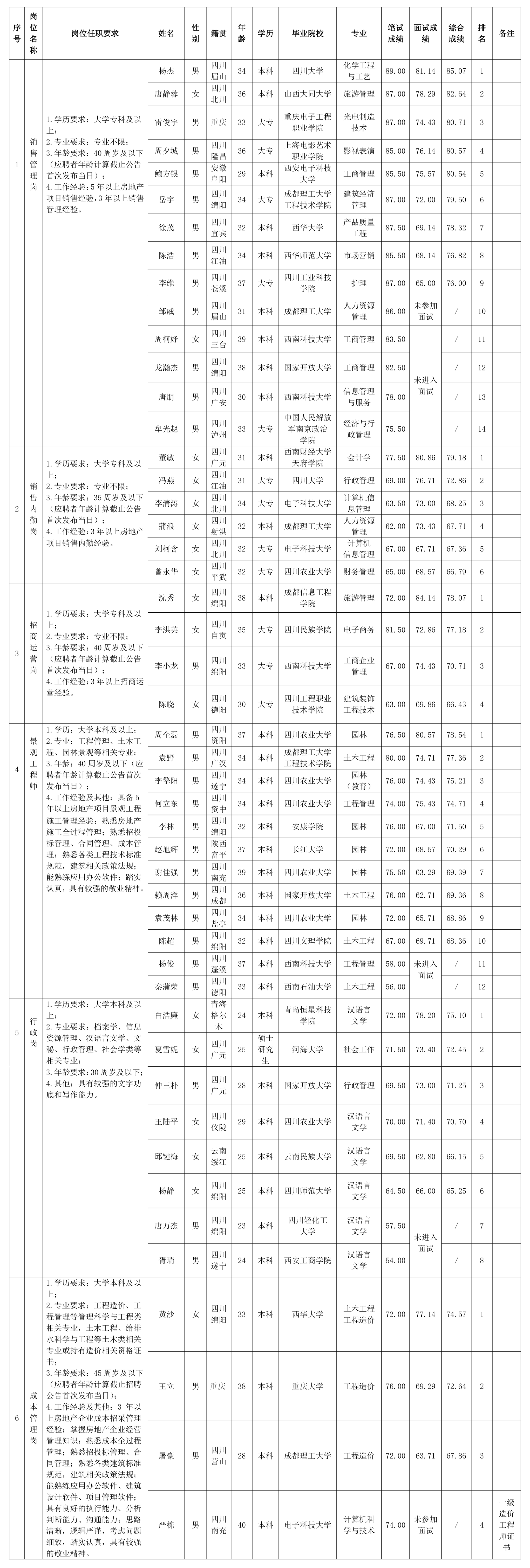 根據(jù)綿陽市綿投置地有限公司發(fā)布的招聘公告及招聘相關規(guī)定,經筆試、面試等程序,現(xiàn)將筆試、面試成績予以公示。