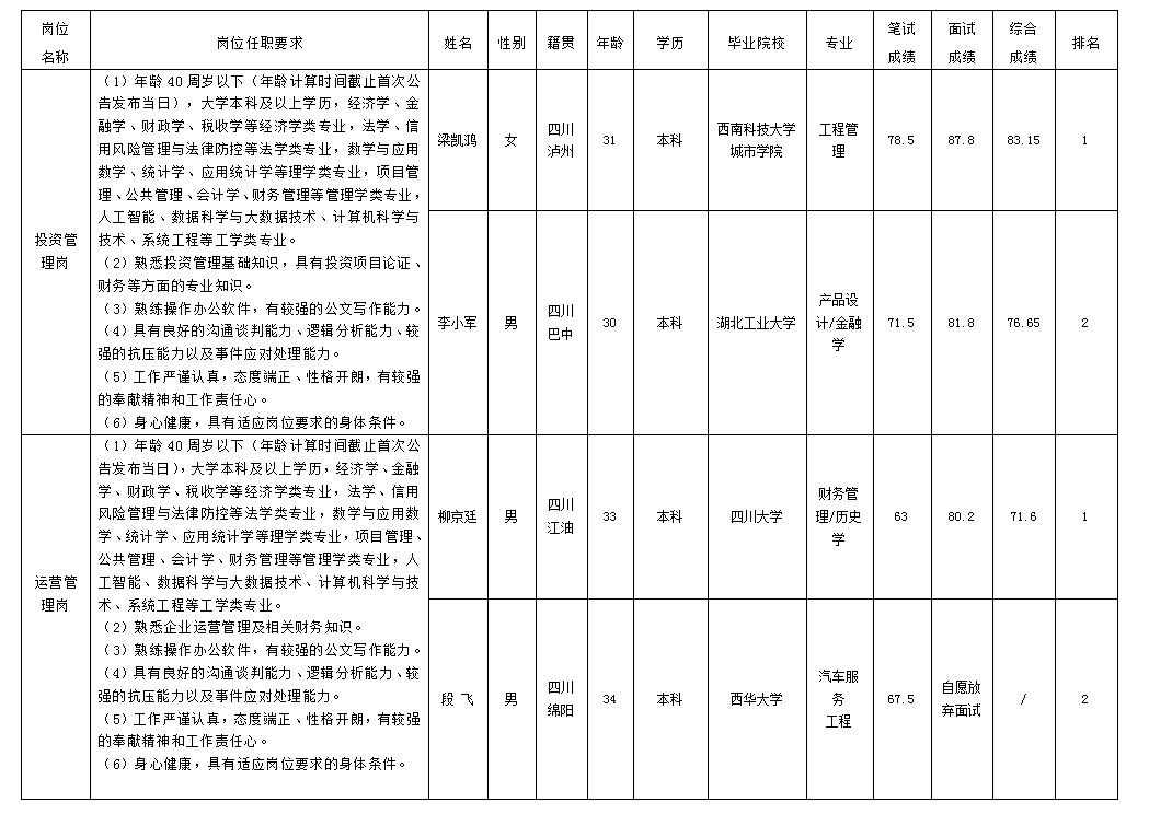 根據(jù)綿陽(yáng)市投資控股(集團(tuán))有限公司發(fā)布的招聘公告及招聘相關(guān)規(guī)定,經(jīng)筆試、面試等程序,現(xiàn)將筆試(面試)成績(jī)予以公示。