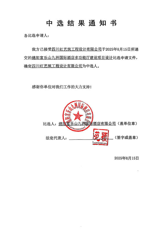 綿陽富樂山九洲國際酒店多功能廳建設(shè)項(xiàng)目設(shè)計中選結(jié)果通知