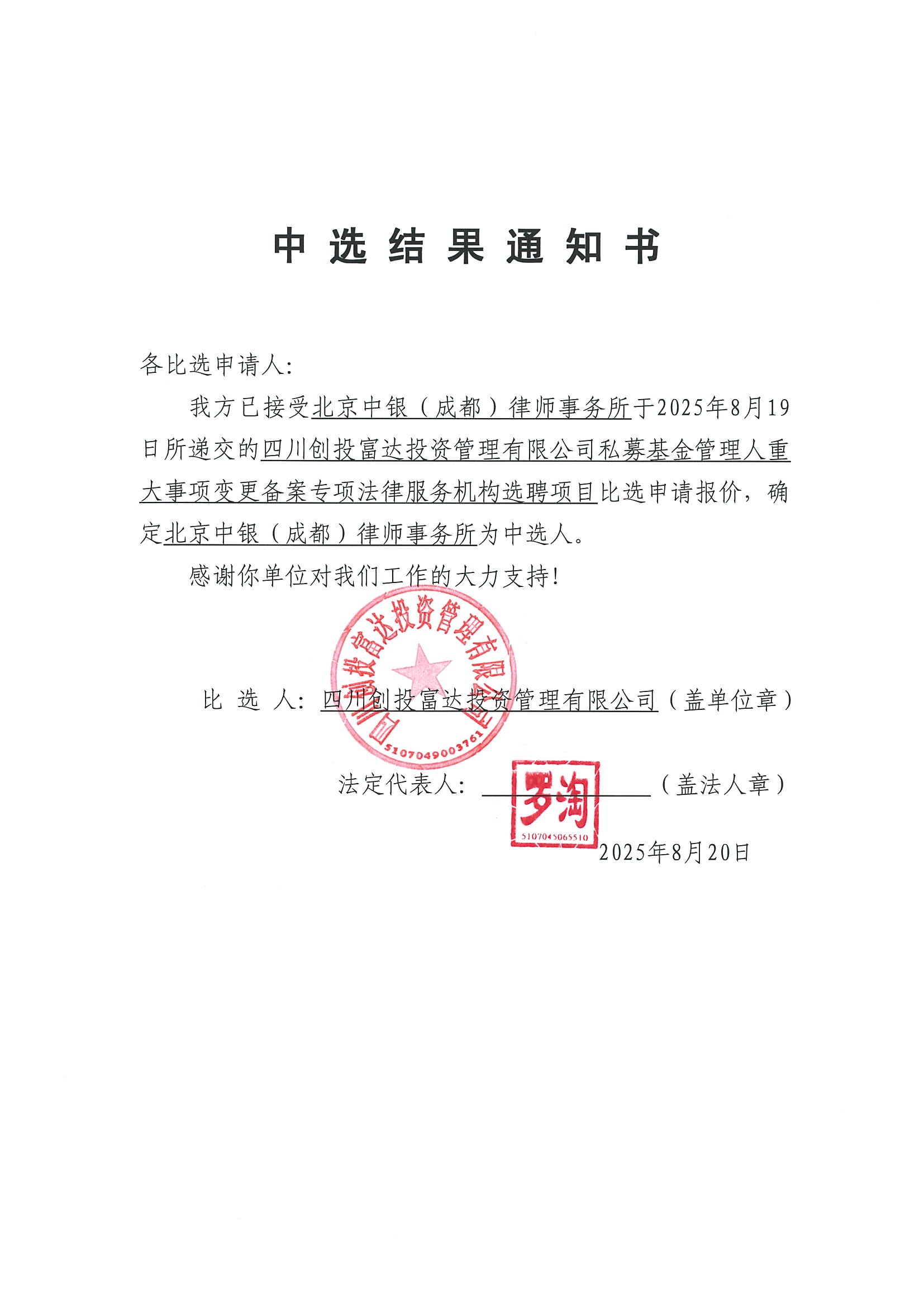 創(chuàng)投富達(dá)私募基金管理人重大事項(xiàng)變更備案專(zhuān)項(xiàng)法律服務(wù)機(jī)構(gòu)選聘中選結(jié)果通知