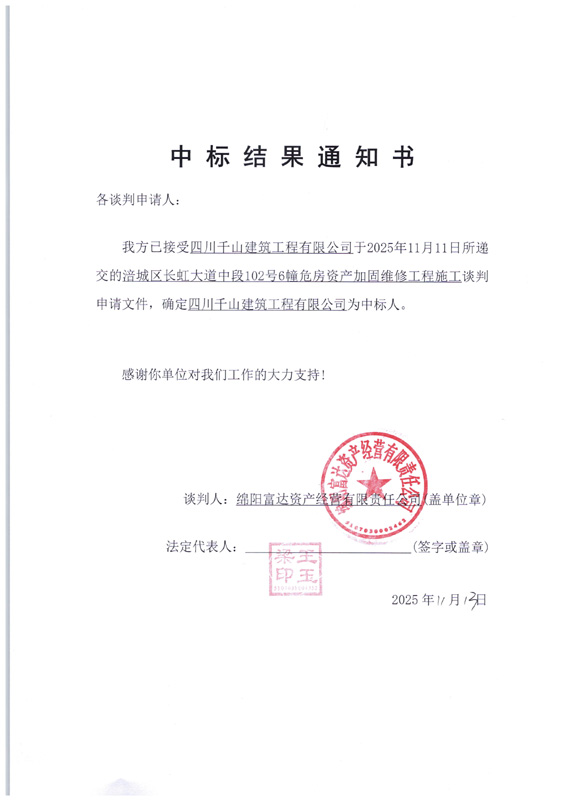 涪城區(qū)長虹大道中段102號6幢危房資產(chǎn)加固維修工程施工中標(biāo)結(jié)果通知